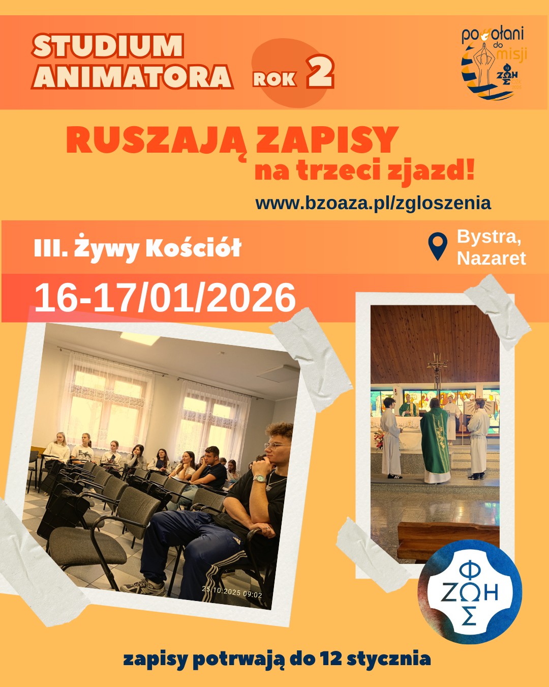 Zapowiadamy kolejny, już trzeci zjazd 2. roku Studium Animatora. W czasie styczniowego zjazdu podejmiemy temat Żywego Kościoła. Spotkamy się w ośrodku "Nazaret" w Bystrej, w dniach 16-17 stycznia br.