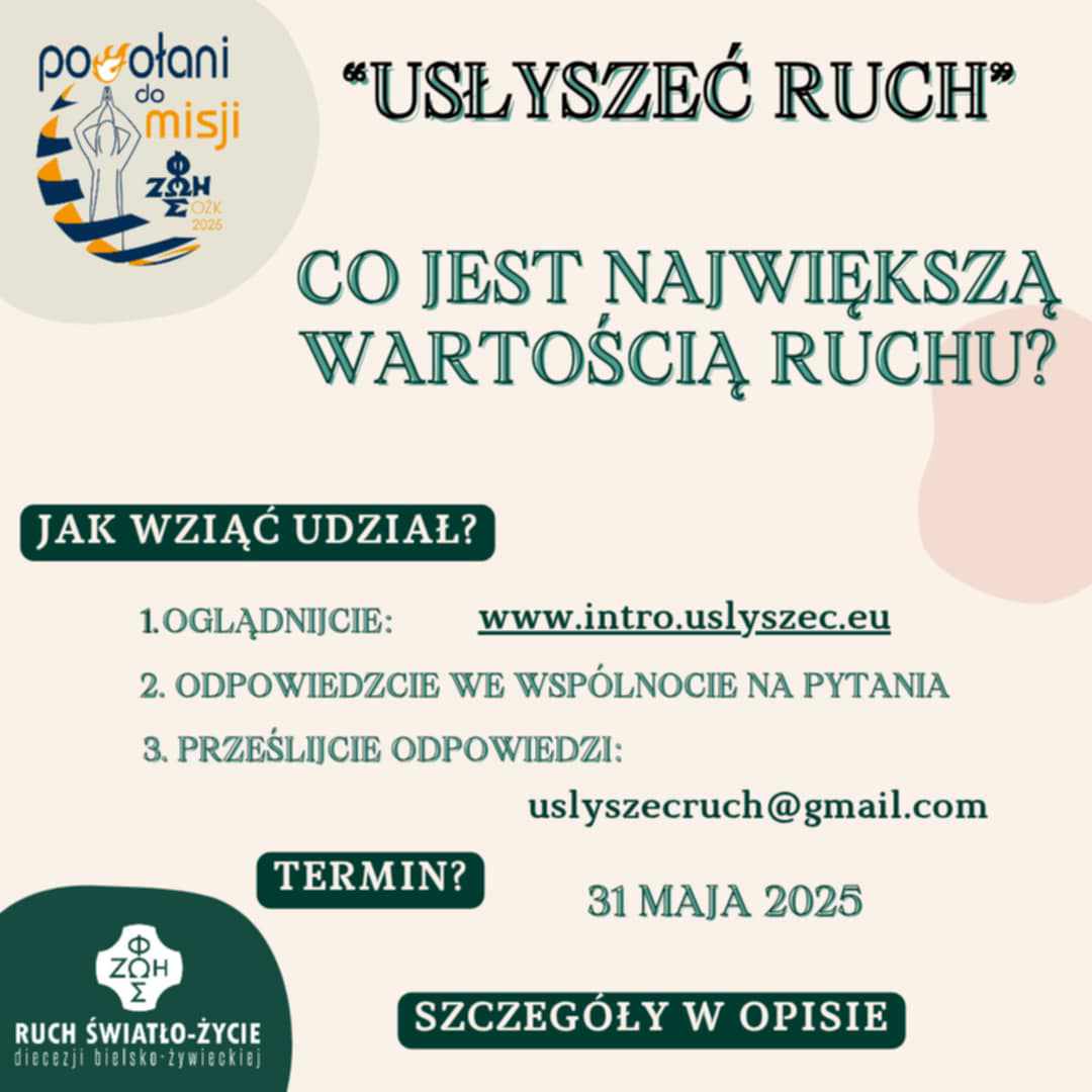 Przypominamy o trwającej akcji Usłyszeć Ruch! Zachęcamy wspólnoty młodzieżowe, Oazy dorosłych, kręgi Domowego Kościoła oraz diakonie do podjęcia refleksji i podzielenia się wnioskami. Na Wasze przemyślenia czekamy do 31 maja.