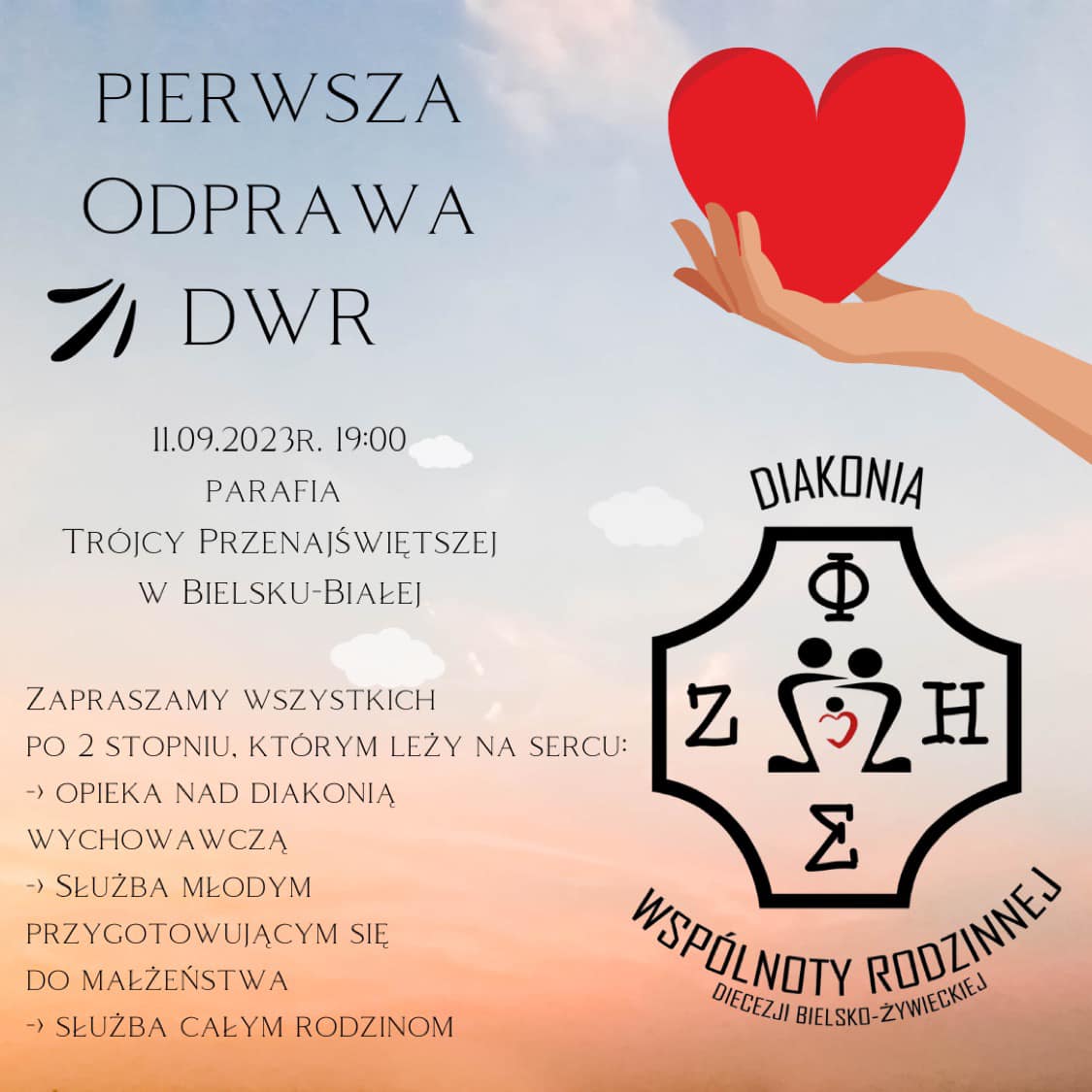 UWAGA! Zatrzymaj się na chwilę! Zapraszamy na pierwszą odprawę DWR! Kiedy? 11.09.2023 (poniedziałek) godzina 19:00. Gdzie? Parafia Św. Trójcy w Bielsku-Białej ul. Sobieskiego 10a. Masz pytania? Napisz do nas! Ten adres pocztowy jest chroniony przed spamowaniem. Aby go zobaczyć, konieczne jest włączenie w przeglądarce obsługi JavaScript. Czekamy właśnie na Ciebie! Razem zróbmy coś pięknego dla Rodziny!