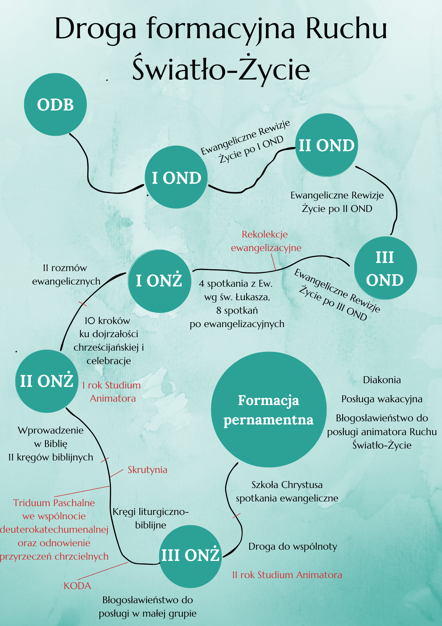 Formację podstawową stanowi przeżycie tematów formacyjnych wg 1. i 2. roku pracy, oazy rekolekcyjnej 1°, 2°, 3° oraz ORAR 1° i 2°